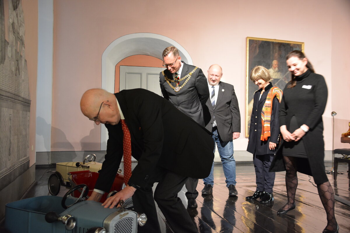 Die Feierlichkeiten rund um die Ehrungen sollten nun mit Sektempfang im Schaudepot des Deutschen Kinderwagenmuseum enden. Jedoch hatte Ernst-Albert Naether noch eine Überraschung parat. Er stellte erneut sein Engagement zur Bewahrung der Zeitzer Geschichte unter Beweis und übergab den zweiten Teil der Sammlung „Naether´sche Kinderfahrzeuge“ als Dauerleihgabe an das Deutsche Kinderwagenmuseum. Nun komplettieren weitere 14 wertvolle Exponate die Sammlung und ermöglichen es, die Produktpalette Naether´scher Kinderfahrzeuge umfassend museal darzustellen.