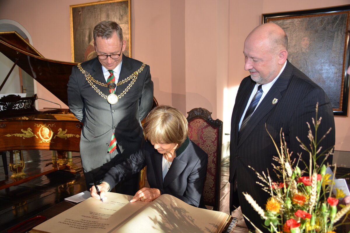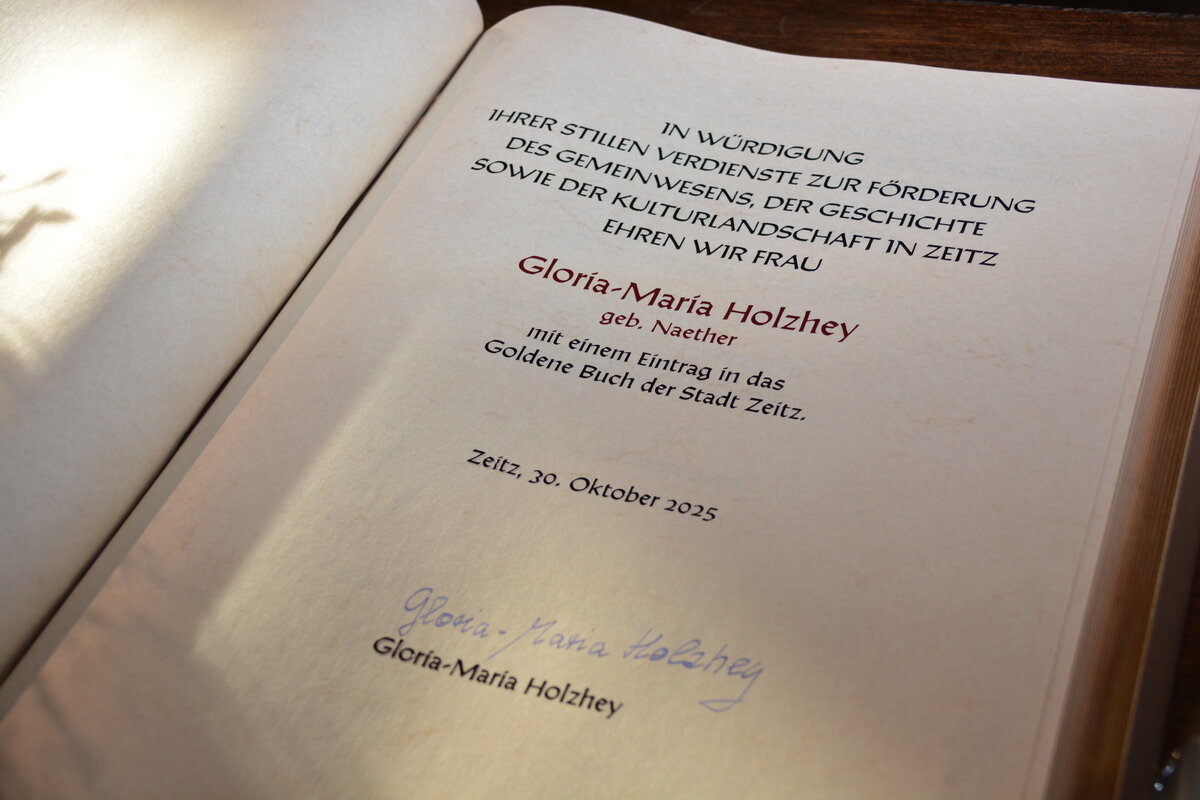 Doch wie bereits beschrieben, engagiert sich nicht nur Ernst-Albert Naether für Zeitz, denn auch seine Schwester Gloria-Maria Holzhey hat mit ihrem meist stillen Engagement zahlreiche Projekte in Zeitz ermöglicht. Deshalb wurde die Gunst der Stunde genutzt, um auch Gloria-Maria Holzhey, geb. Naether, für ihr großes finanzielles Engagement rund um die Nonnenkapelle in der Zeitzer Michaeliskirche und zu vielen anderen Gelegenheiten mit einem Eintrag in das Goldene Buch der Stadt Zeitz zu ehren.
