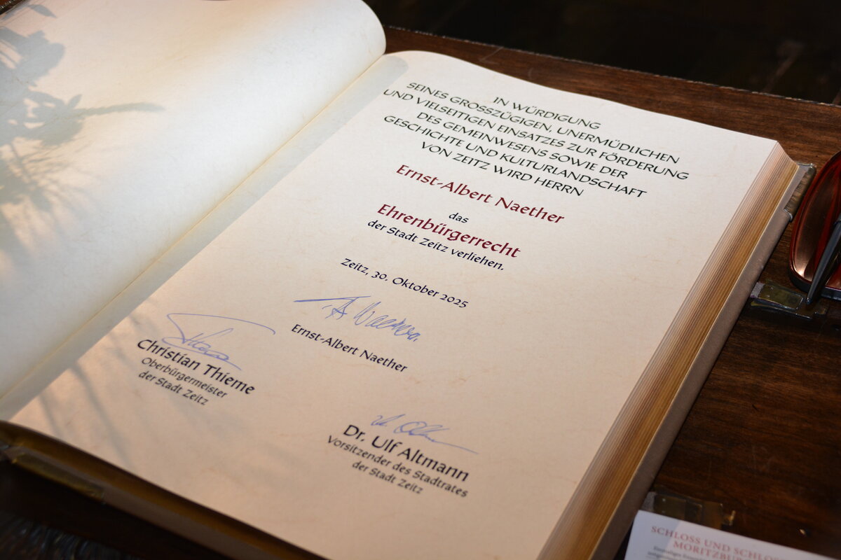 Der Zeitzer Stadtrat hat in seiner Sitzung am 9. Oktober 2025 den Beschluss gefasst, Herrn Ernst-Albert Naether für seinen großzügigen, unermüdlichen und vielseitigen Einsatz zur Förderung des Gemeinwesens sowie der Geschichte und Kulturlandschaft von Zeitz das Ehrenbürgerrecht zu verleihen.